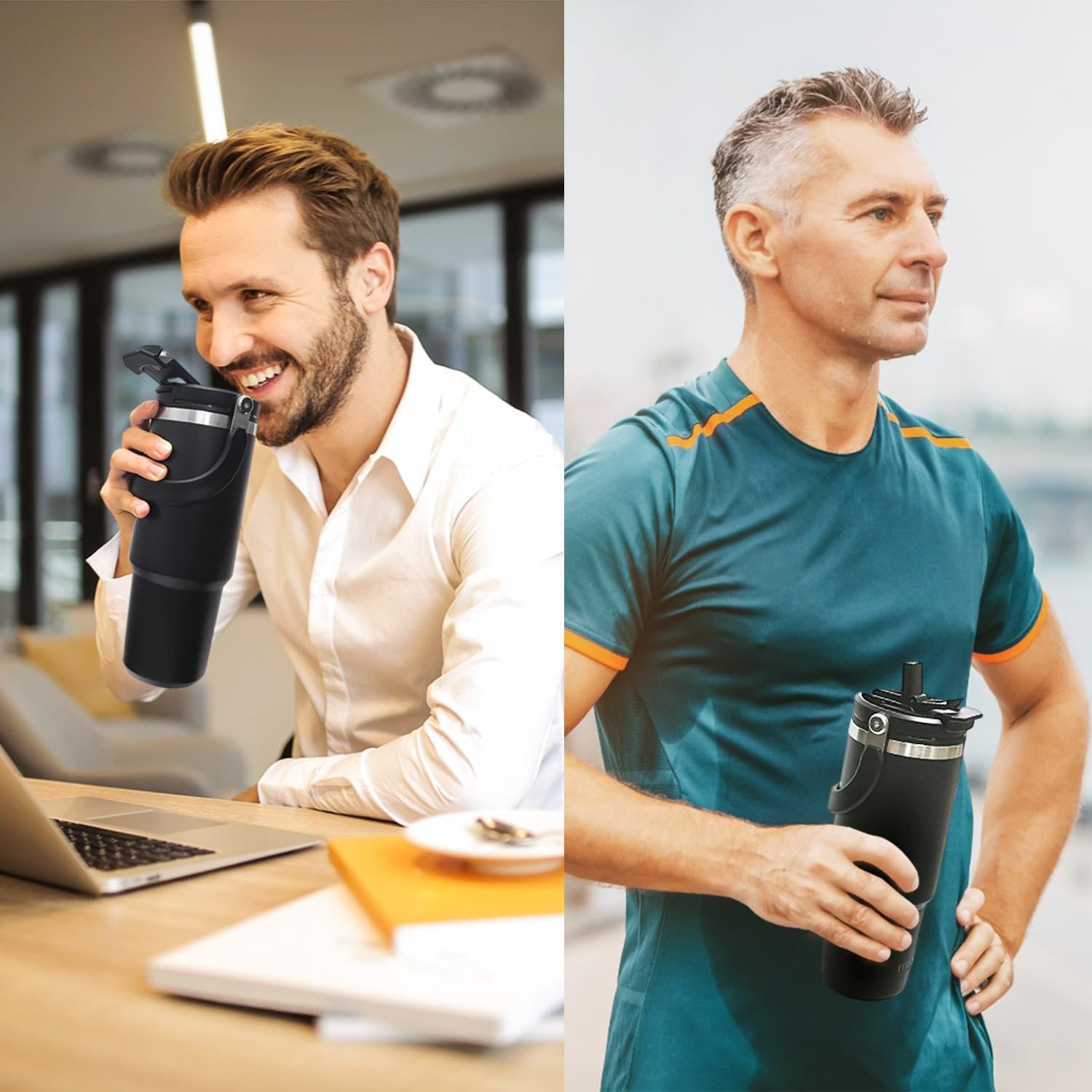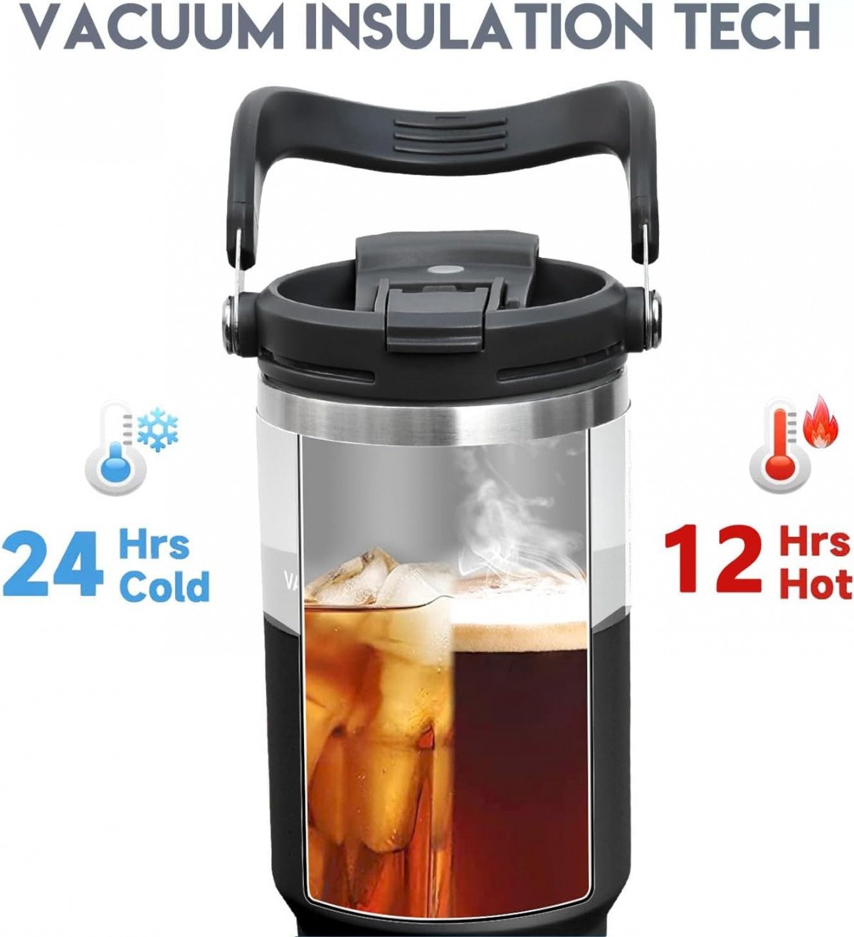 PORTABLE LARGE CAPACITY : Whether you’re driving to work or running errands, the tapered slim-base design of our 40oz insulated tumbler allows it to fit perfectly in most car cupholders, and the wide and thick ergonomic handle is more convenient and lightweight to hold, reducing the pressure of hand.